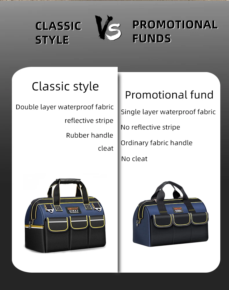 • Alta capacidade armazenamento:Os sacos de ferramentas multifuncionais AIRAJ têm um armazenamento de alta capacidade, permitindo armazenar todas as suas ferramentas e equipamentos em um só lugar.
