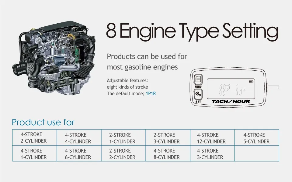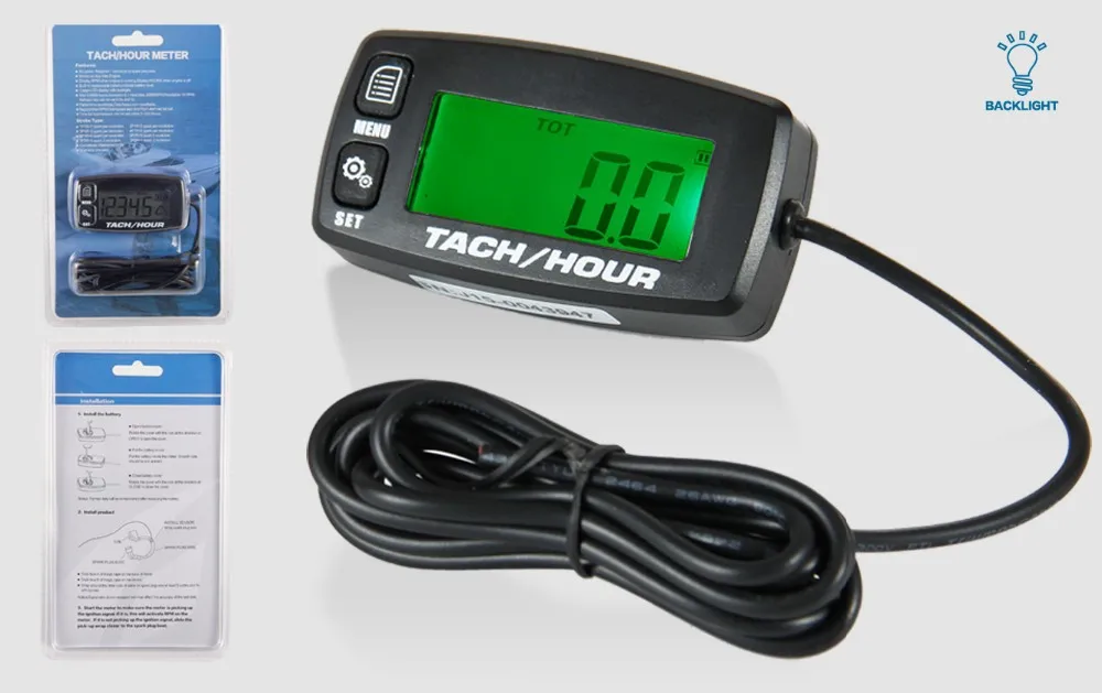 Este tacômetro registra as horas totais de funcionamento e o tempo parcial do motor a gasolina, obtendo a indução do cabo da vela de ignição. O horímetro mostra horas totais e tempo parcial acumulado.O tempo parcial pode ser visualizado e redefinido pressionando o botão.