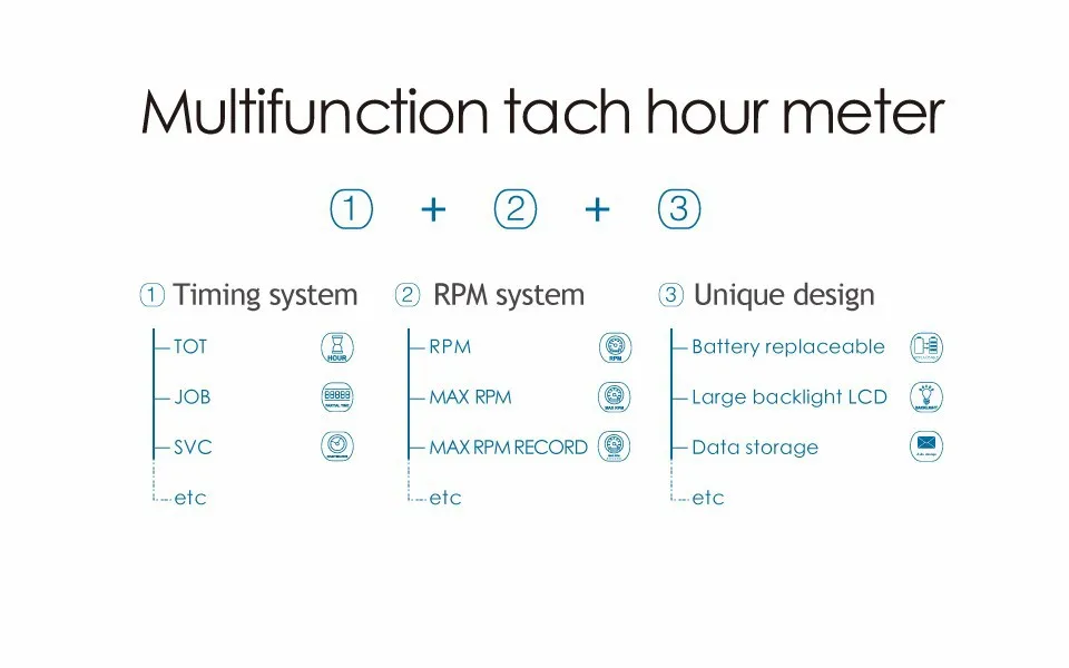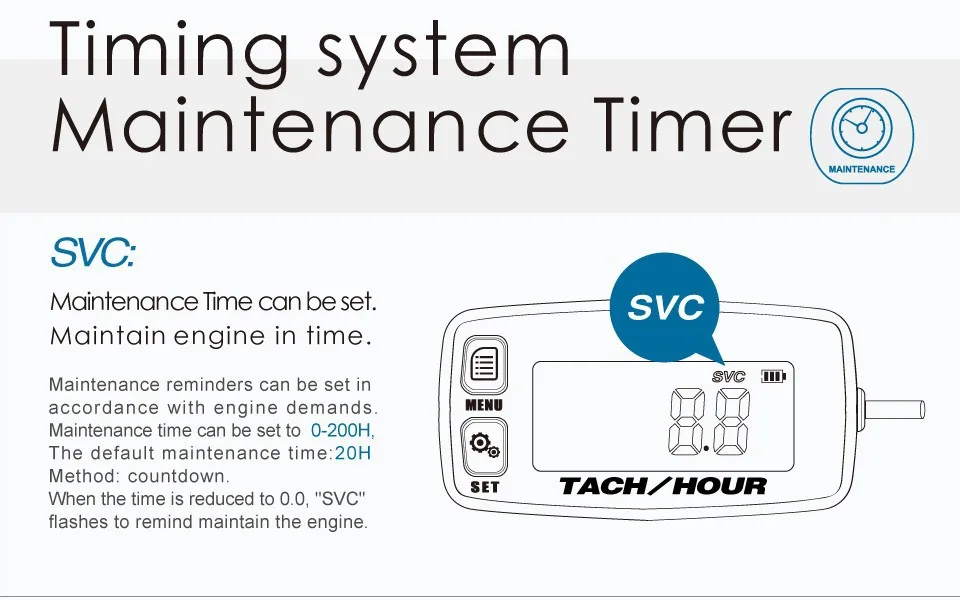 O motor a gasolina requer manutenção no momento certo, para garantir um bom desempenho. A função SVC do tacômetro é lembrar no momento certo. Este horário pode ser definido pelo usuário.Esse é um ótimo horímetro ou cronômetro.