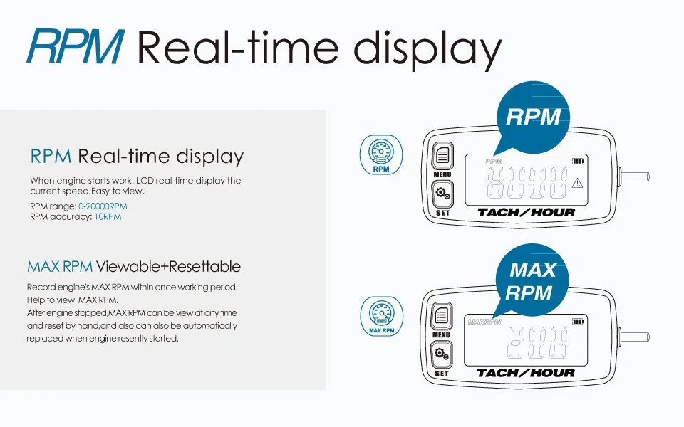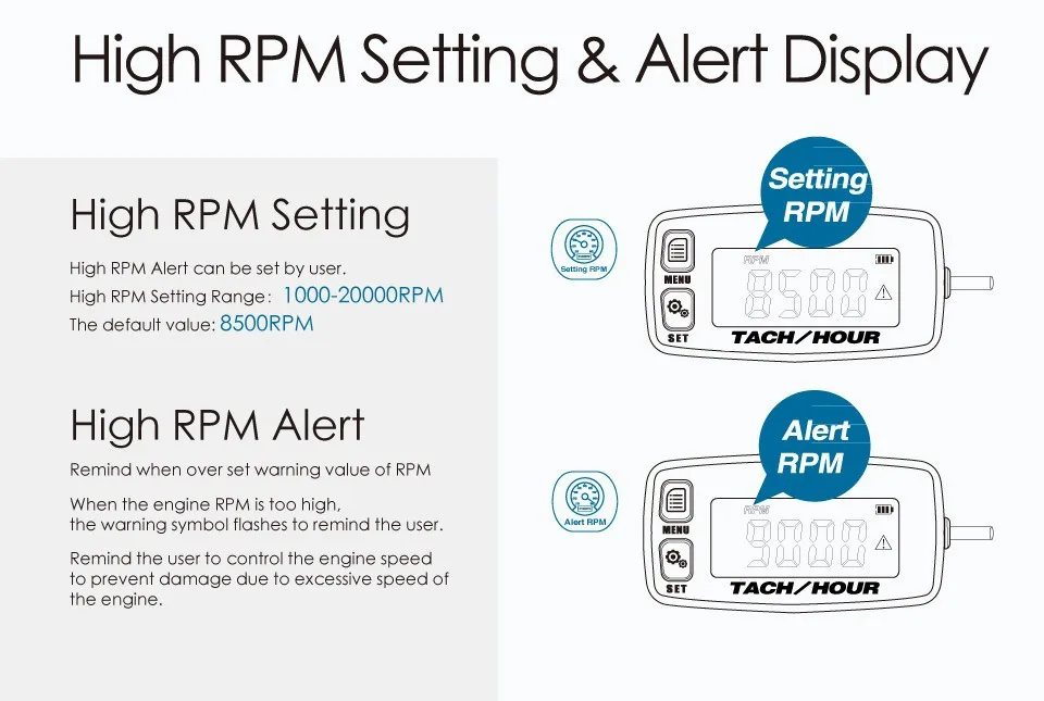 Quão altas RPM danificarão o motor com base na marca do motor. Marca diferente, RPM limitadas diferentes.Longo tempo de alta rotação danificará o motor. Quão importante é lembrar altas RPM!Este tacômetro pode definir o alerta de excesso de RPM pelos usuários.