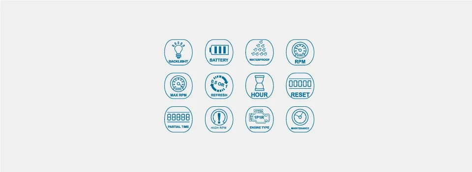 O contador de horas do tacômetro mostra as RPM atuais quando o motor está funcionando. A precisão do tempo é de 10 RPM. Comparado com o tacômetro com ponteiro, ele exibe RPM com mais precisão.O que é mais notável é que o tacômetro pode registrar as RPM MÁXIMAS do motor dentro de um período de funcionamento.
